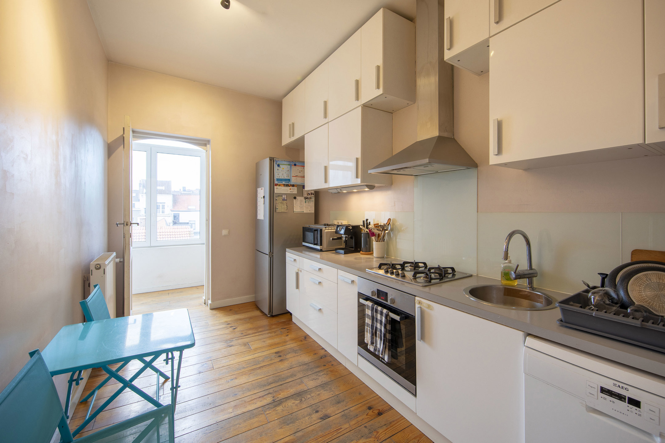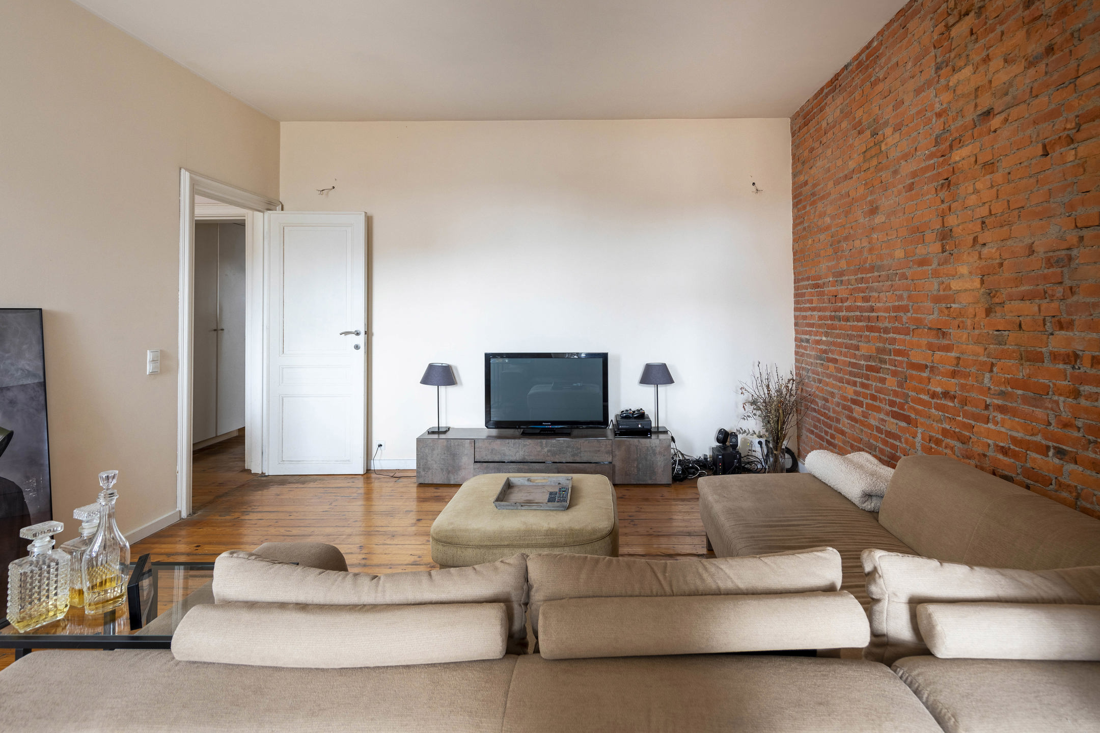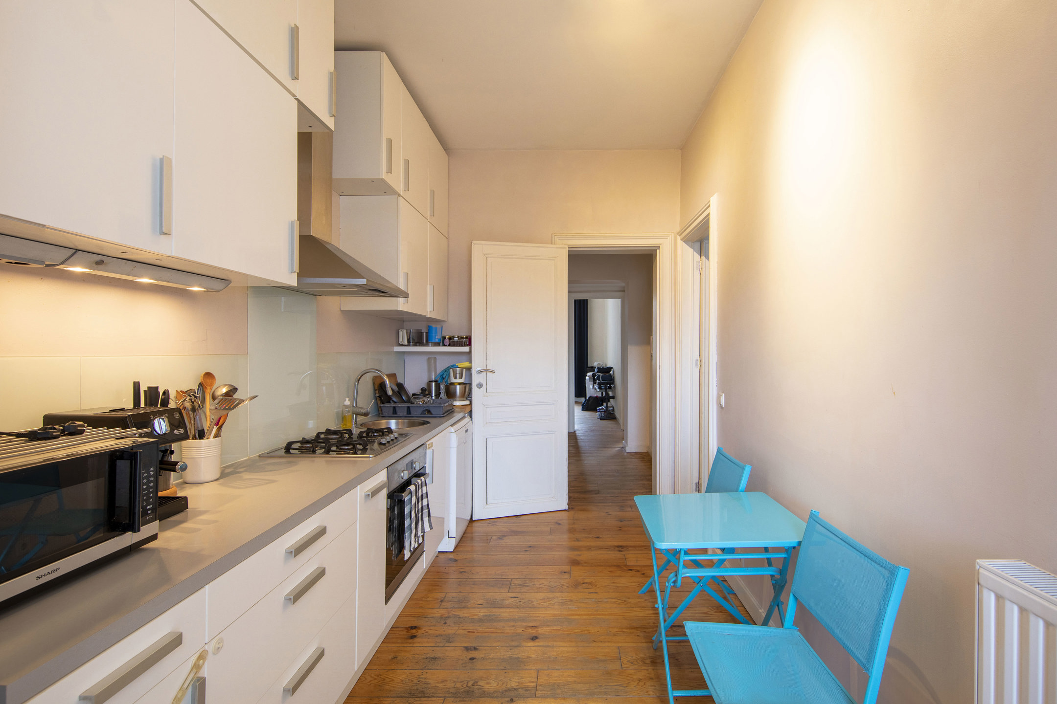 IXELLES, beautiful APARTMENT (2 bedrooms/1 bathroom) of ± 110 m² gross, located on the 2nd floor of a small co-ownership without lift. It consists of an entrance hall with cloakroom and guest toilet, a pleasant living room with a dining room, a fully equipped kitchen, a covered terrace withwith pantry, 2 bedrooms (± 17 and 11,5 m²) the largest with a new dressing room, a bathroom and a boiler room/laundry room with washing machine. Miscellaneous: new individual condensing boiler, double glazing, high ceilings. In the living room, new false ceiling with LED spotlights. Bicycle/buggy room on the ground floor and a 9,5 m² cellar in the basement.