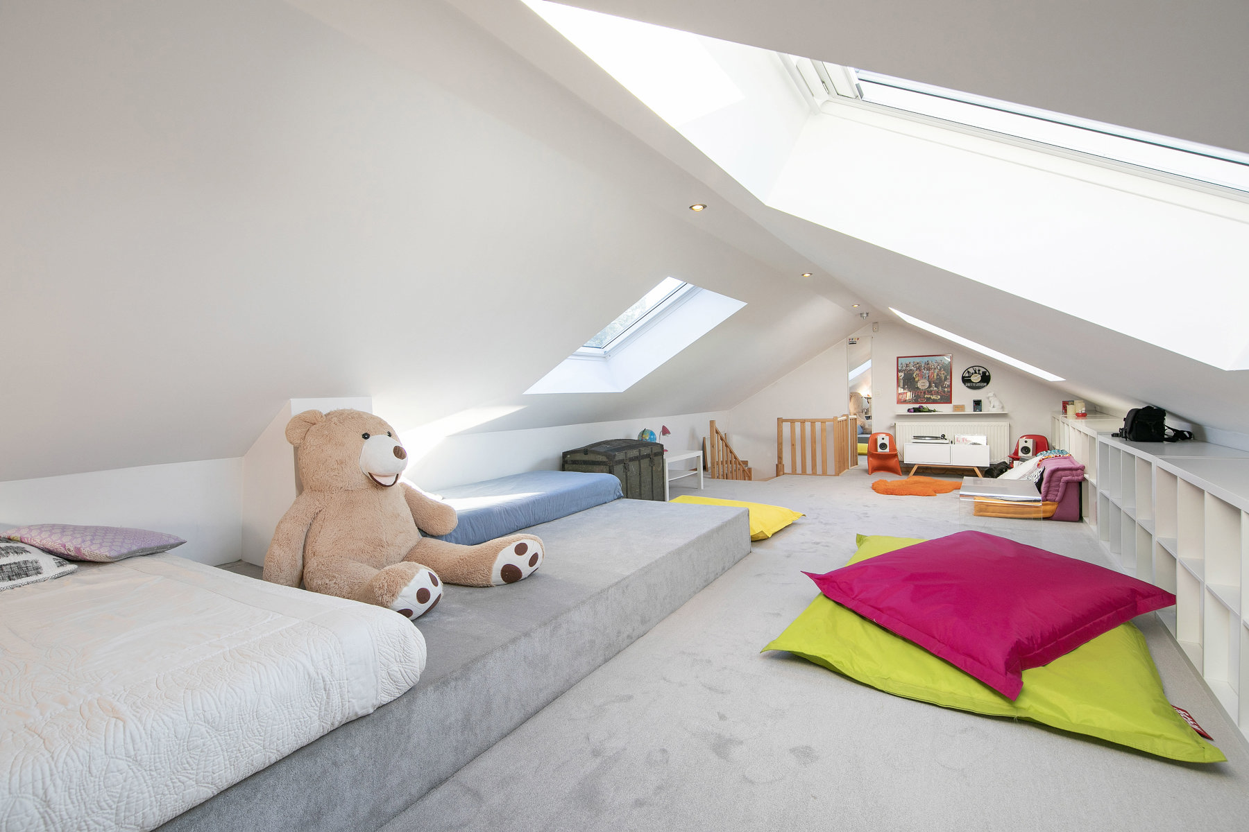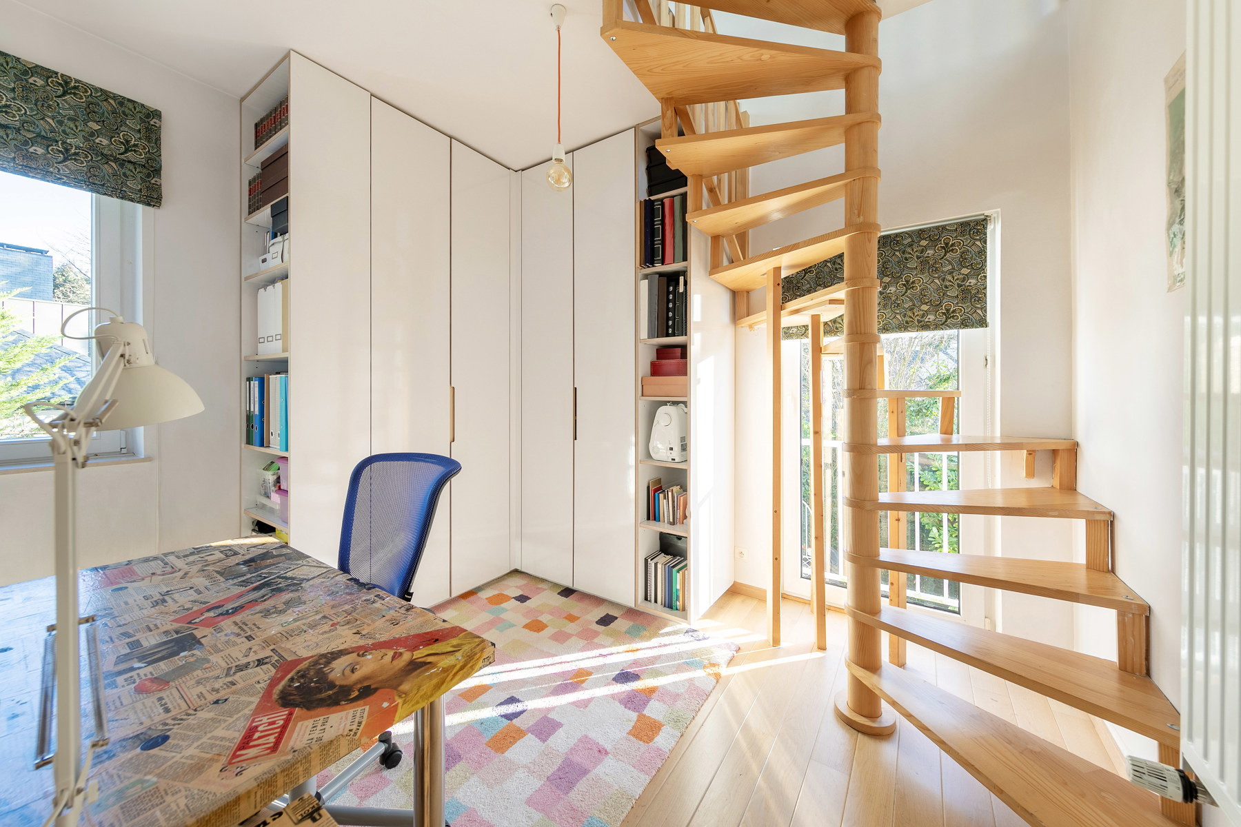 Bedroom 5 ± 9.5m², sink, parquet flooring, and staircase to the top floor