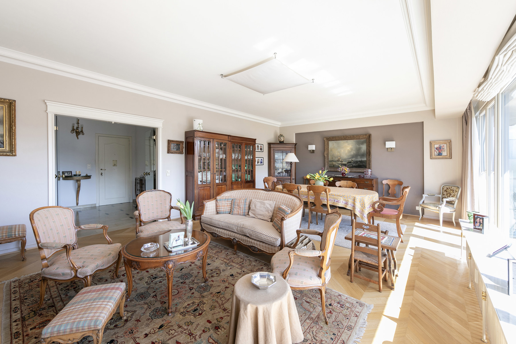 Luminosité : la situation à un étage élevé et l’orientation sud offrent une vue dégagée et une excellente lumière naturelle dans les pièces de réception.
